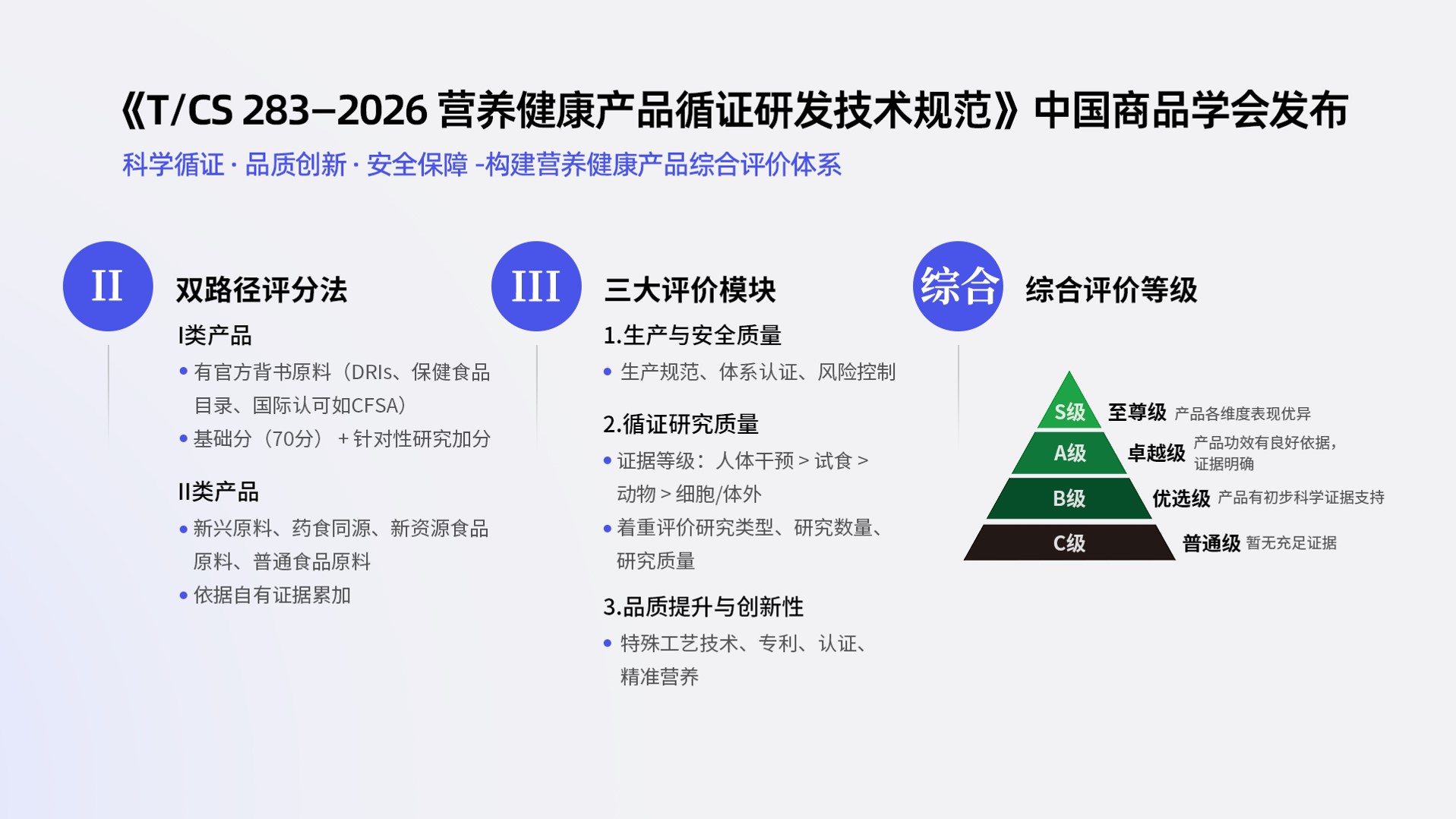 本次发布的标准创新性构建“循证研究、产品创新、生产质量”三维评价体系,并提出S/A/B/C四级证据的“质量等级金字塔”,首次在行业内实现对产品的全链路量化评估。这为整个行业建立了从研发源头到产品宣称的科学底线,让产品的“有效”有据可依、有级可循。