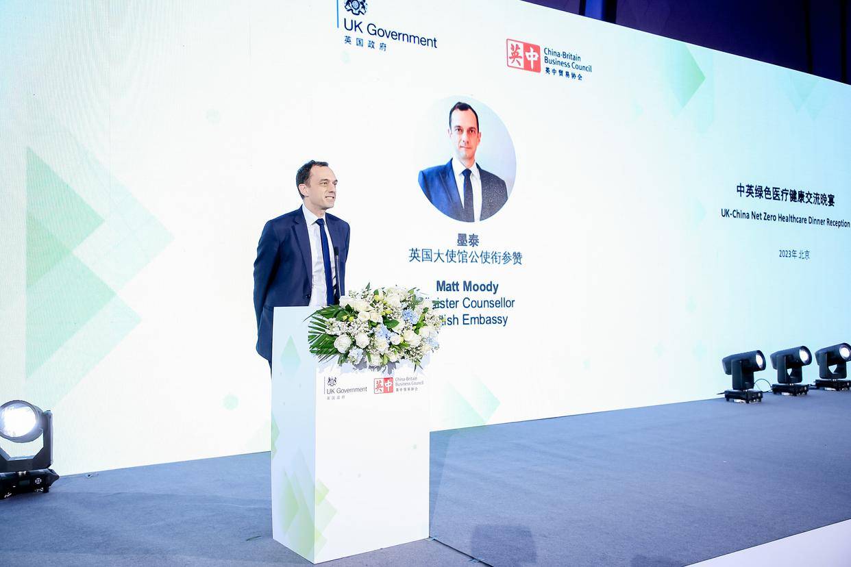 当日晚间,中英两国嘉宾共同参加了以“合作共赢”为主题的交流晚宴,英国大使馆公使衔参赞墨泰在晚宴现场致欢迎词。本次活动汇聚了中英两国政府、英中贸易协会、英国国家医疗服务体系、ESG专家、中英研究机构、大学以及相关行业代表,展示了两国在碳中和卫生服务方面的创新,为促进两国在绿色医疗健康服务领域的合作创新和长远发展,进行了充分交流探讨。