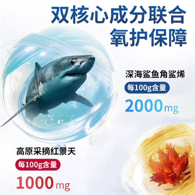 生产环节采用超临界CO₂低温萃取技术,全程杜绝化学溶剂介入,完整保留角鲨烯的天然分子结构与活性。产品含量标注清晰,每100克软胶囊中角鲨烯含量达2000mg,兼具高纯度与高活性优势。