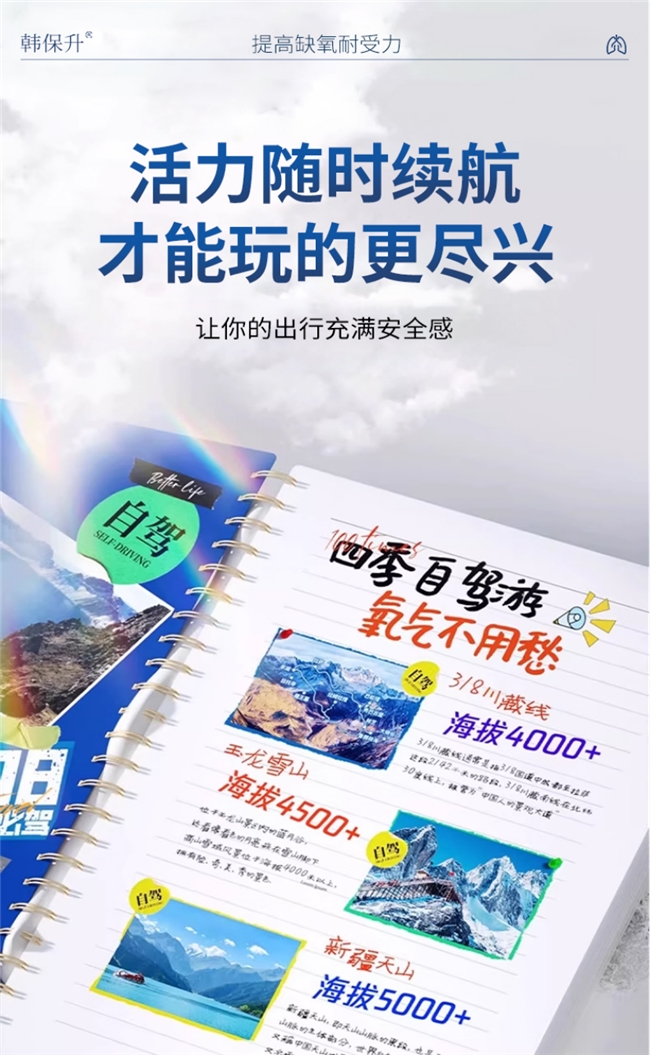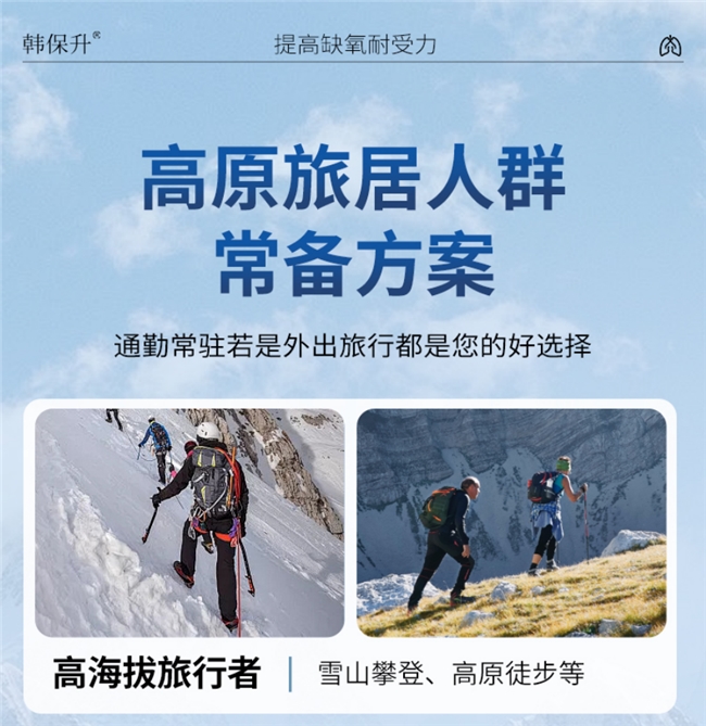 行业内很多单一成分的抗高反产品,仅能实现单一预防或补氧,无法形成全流程防护,导致出行中仍会遇到困扰。韩保升的双形态组合,构建“预防-补氧-适应”的全流程防护体系,实现1+1>2的适配效果。
