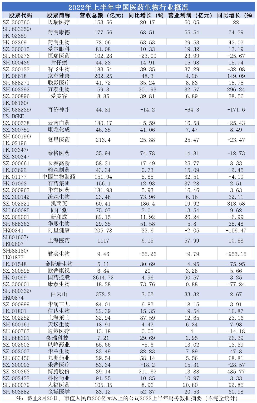 《医药经济报》汇总分析了国内上市药企市值300亿以上的公司2022年上半年的财务摘要,今年医药二级市场局面可谓“泥沙俱下”,企业经营环境也面临着各种考验与压力。