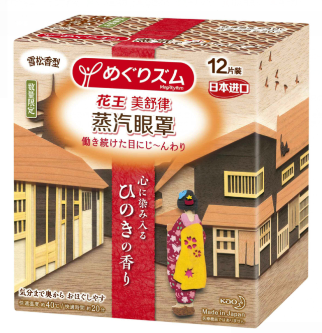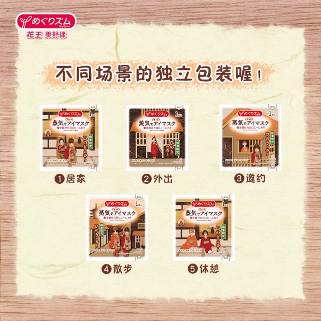 “花王美舒律蒸汽眼罩雪松香型”的包装古朴典雅,每个独立包装似乎勾勒出和风式的日常生活画卷,不同的场景的独立包装在使用时更增添不同乐趣。