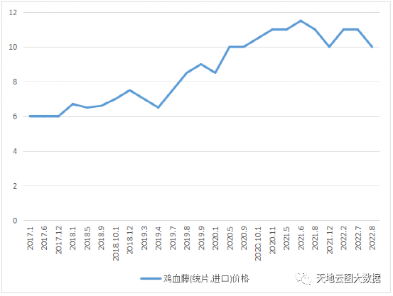 以进口统片为例,2013年之前,鸡血藤价格基本在4元以下徘徊;2013年之后随着采收、生产成本逐渐上涨,行情缓慢上行,但由于库存和产量制约,价格以缓涨为主,没有体现其经济价值,2019年上半年之前,其价格都没有突破8元。