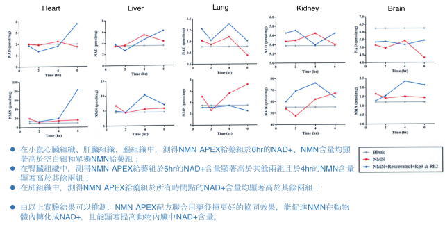 从元岁荣养与澳门药物及健康应用研究院的《NMN基础配方》第三期报告得出:NMN APEX黄金配方(即:NMN+白藜芦醇+人参皂苷),相较于单纯补充NMN,NAD+的转化率即于各器官的浓度得到大幅提升。