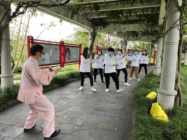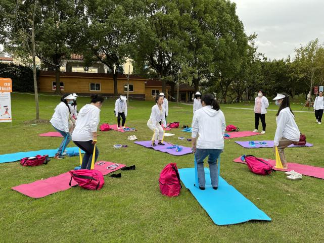 在另一头的绿地上,“做运动”打卡点的一支队伍正在练习抗阻力,一旁的志愿者老师同步指导:“我们女性到了更年期之后,一定要做一个抗阻力运动,这是对肌肉进行一个强化训练的运动,而这样的抗阻运动最好能达到每周2次以上。”